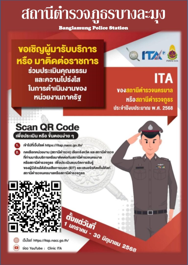 ขอเรียนเชิญทุกท่านร่วมตอบแบบประเมิน ผู้มีส่วนได้ส่วนเสียภายนอก External Integrity and Transparency Assessment (EIT) ปี 2568 เพื่อประเมินคุณธรรมและความโปร่งใสในการดำเนินงานของสถานีตำรวจภูธรบางละมุง ช่องทางการตอบแบบวัดการรับรู้ของผู้มีส่วนได้ส่วนเสียภายนอก (EIT)