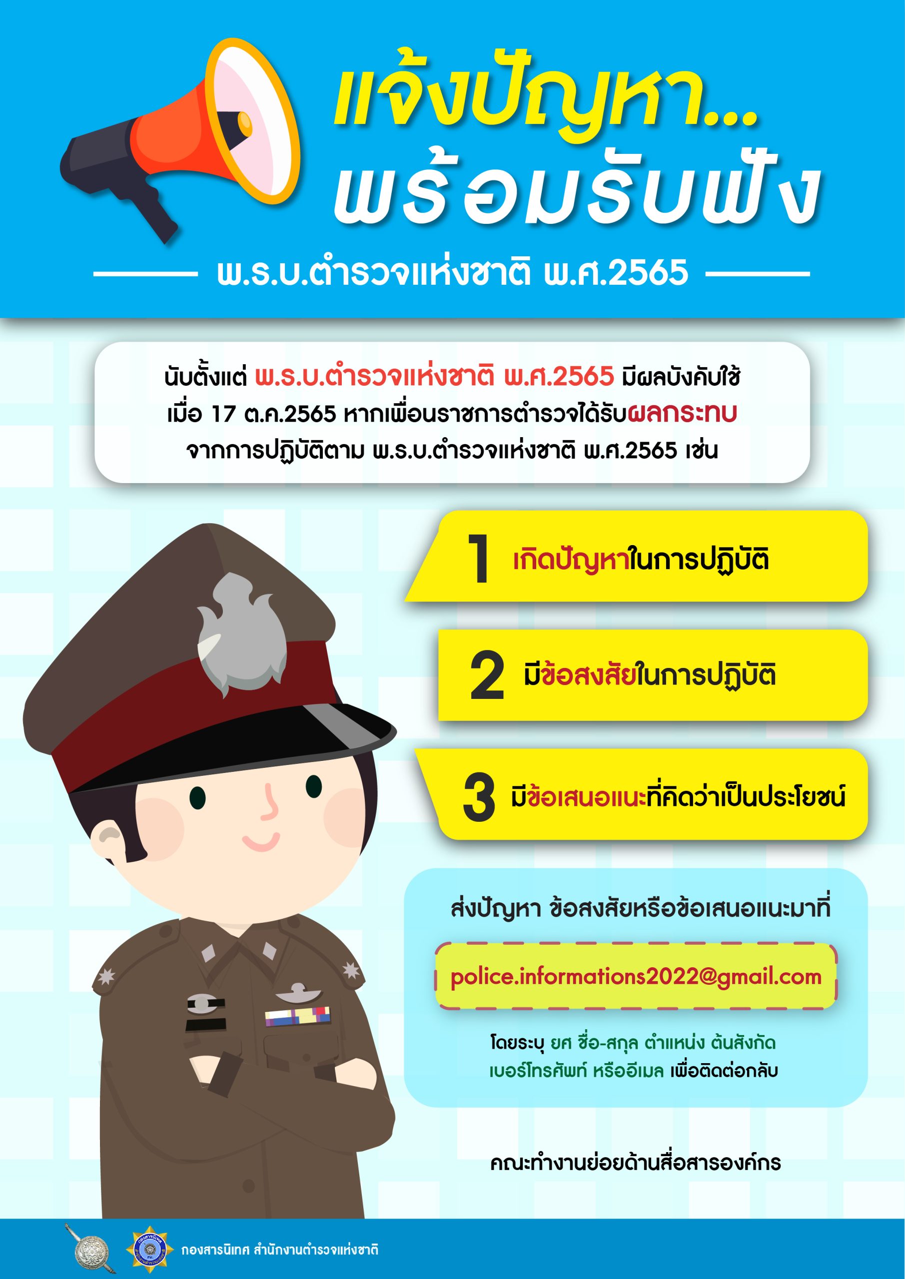 สามารถส่งปัญหา ข้อสงสัย หรือข้อเสนอแนะมาได้ที่อีเมล police.informations2022@gmail.com
